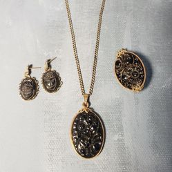 Beautiful Vintage Jewelry Set! Necklace With Matching Earrings And Brooch! Gold Toned With Black Carved Stones!$10San Antonio, TX