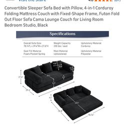 Convertible BONELESS COUCH with Pillow, 4-in-1 Corduroy Folding Mattress Couch with Fixed-Shape Frame, Futon Fold Out Floor$150San Antonio, TX