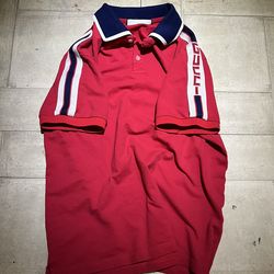 Gucci Red Polo Shirt With Navy Collar Featuring Gucci Branding In Sleeve Size large$80San Antonio, TX