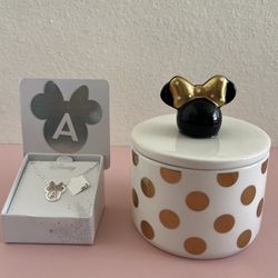 Disney Minnie Mouse Jar/Box White Black Gold Dots & Necklace Silver Gold Rose $35San Antonio, TX