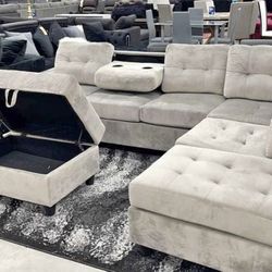Silver / Gray Water Resistance Fabric Reversible Sectional With Cup Holder And Storage Ottoman. Brand New. $750San Antonio, TX