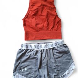 “Bright orange Puma athletic T-shirt and gray Under Armour short shorts, practic$8Austin, TX