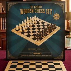 la imagen es un set de ajedrez de madera, posiblemente de la marca "Happy Hour Workshop$20Katy, TX