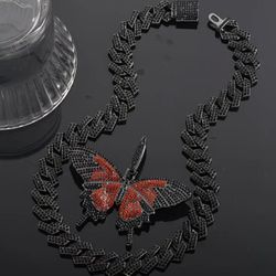 Iced Out Black Gold Plated A+Cubic Zirconia Premium Red Black Butterfly Pendant With 20"Cuban Necklace, Valentine's Gift $35Houston, TX