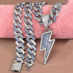 3-Pcs Men's Iced Out 14K White Gold-Plated Light Blue Silver Cubic Zirconia Lightning Bolt Pendant W/24" Cuban Chain Necklace & Bracelet Set $30Houston, TX