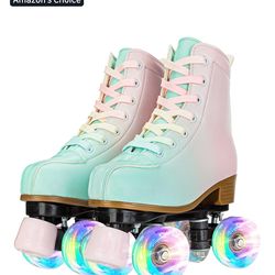 Roller Skates for Women, Fantastic Gradient Pink and Green PU Leather Light Up Roller Skates, Indoor Outdoor