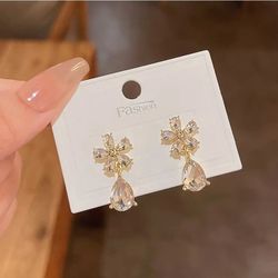 Korean Style Flower Drop Earrings 18K Gold Plated Rhinestone Crystal Pearl Dangle Elegant Wedding Jewelry