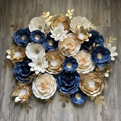 Elegant Paper Flower Wall Set – Gold, Cream & Navy Blue – Set of 24 Flowers (Small, Medium, Large)$185Houston, TX
