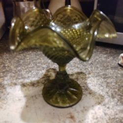 Vintage Ruffled Edge Olive Green Glass Compote With Stem. 6.25” Tall 6.25” Wide$25Houston, TX