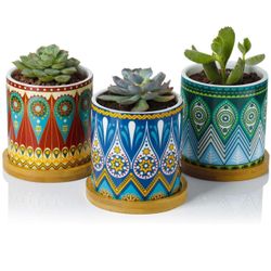 New Succulent Plant Pots - 3 Inch Small Ceramic Planters with Bamboo Tray and Drainage Hole, Colorful Mandala Patterns Gifts Set of 3$20Katy, TX