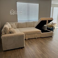 Beige Fluffy Corduroy Sectional Couch With Pop Up Bed & Storage Delivery Available 🚚$1,300Katy, TX