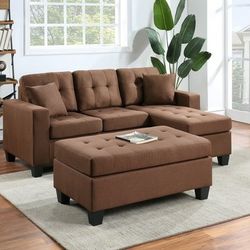 Naomi Reversible Brown Linen Sectional Sofa with Ottoman
