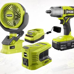 Ryobi 18v 1/2” impact wrench, 18v inverter, 18v clamp fan with 4ah battery and charger$210Houston, TX