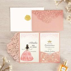 New DORIS HOME 50pcs Laser Cut Quinceanera Invitations Pink, 4.7x7.1 Blank Quince Invitations for 15th Birthday, Invitation cards for Sweet 16 with En$45Red Oak, TX
