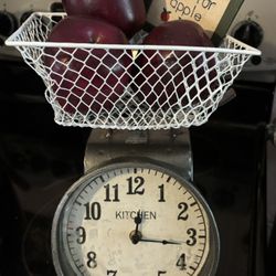 Super Cute Heavy Metal Faux Kitchen Scale With Clock And Basket Of Pecan Artificial Apples$20Arlington, TX