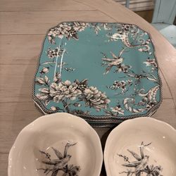 Darling 222 Fifth Adelaide Turquoise Dinnerware 4 dinner plates and 4 bowls. Floral and bird toile pattern. $25/all dishes. Located in Murray cash/Ven$25Salt Lake City, UT