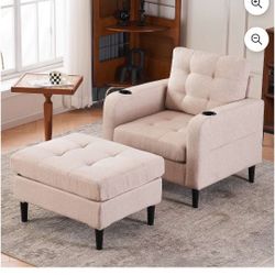 Beige Upholstered Armchair and Storage Ottoman Set - Comfortable Single Sofa with Cup Holders and Tufted Detailing, Ideal for Living Room or Bedroom $$140Virginia Beach, VA