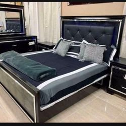 πΉ Queen Size Panel Bed, Nightstand, Dresser, Mirror Full LED Black Bedroom Set π Showroom Availableπ In Stockβ