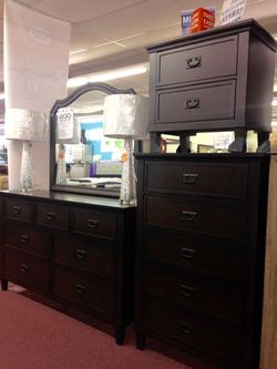 Dark Brown Wooden Bedroom Set; Bed Frame, Dresser, Night Stand, Mirror โ