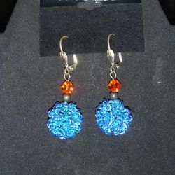 Handcrafted Aqua Wire Ball Orange Bead Dangle Earrings Silver