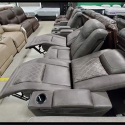 Leather Gray Drop Down Table Power Reclining with Adjustable Headrests Sofa Couch π₯π₯π₯ In Stock β