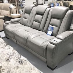 Genuine Leather Gray Power Reclining Sofa | Drop Down Table | USB Charging| Power Adj. Headrestπ₯ In Stock β