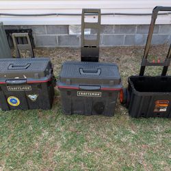 3. Craftsman roll around tool boxes with extendable handles. The toolbox on the far right has no lid. The toolbox on the far left is missing. One latc$100Portsmouth, VA