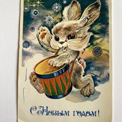 1983 Happy New Year! Funny Bunny with a drum ART Christmas OLD Soviet Postcard$10Virginia Beach, VA