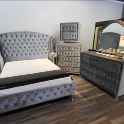 LH 👉 Alzire Gray Tufted Velvet Upholstery Queen Bedroom Set, Nightstand, Chest, Dresser With Mirror $3,329Virginia Beach, VA
