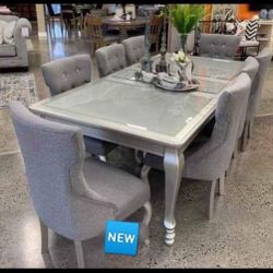 Table Top Glass Silver Metallic Extension Rectangular Dining Table And Upholstered Chairs Set 🫵 7 Piece✌🏻✌🏻 New Brand 🤩 Financing$2,519Virginia Beach, VA