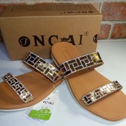 NWT Womens Size 8 Gold Silver Bling Sandals Slides Flats Slip-Ons Rubber Bottom
