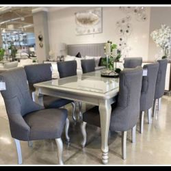7 Piece So Chic Tabletop Glass Extension Silver Metallic Dining Table And Gray Upholstered Chairs🔥New Brand🫵Financing✅Fast Delivery 💯$2,519Virginia Beach, VA