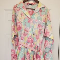 Vtg 1980s Ellen Hart Original Pink Pastel Floral Shirt Dress W/ Belt Flower 22 T
