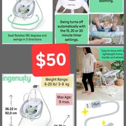 Ingenuity SimpleComfort Lightweight Compact 6-Speed Multi-Direction Baby Swing, Vibrations & Nature Sounds, 0- 9 Months 6-20 lbs$50Unger, WV