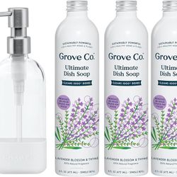 Grove Co. Ultimate Dish Soap Refills (3 x 16 Fl Oz) + Refillable Glass Dish Soap Dispenser for Kitchen Sink with Non-Slip Silicone Sleeve, Plastic Fre$15Lynnwood, WA