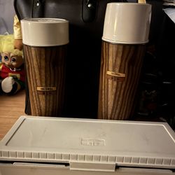 Vintage Lunch Box 70's Woodgrain Thermos Set, Bag, Box, And Two Tall Thermos $30Port Orchard, WA
