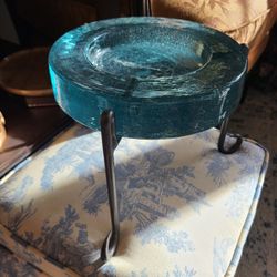 Aqua Seeded Hand made Art Sea glass Bowl Plate iron Stand Boho MCM Yellowstone $100Mukilteo, WA
