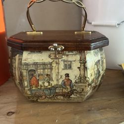 Vintage 70s Decoupage Purse Wood Anton Pieck Market Scene Octagonal Metal Handle$30Port Orchard, WA