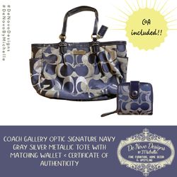 Coach Gallery Optic Signature Navy Gray Silver Metallic Gallery Tote W/Matching Wallet & Certificate Of Authenticity $99Everett, WA