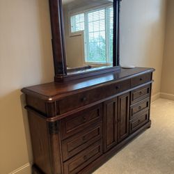 Dresser + 2 Nightstands + Matching Mirror – Dark Wood Bedroom Set$375Renton, WA