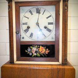 1(contact info removed) New Haven antique wood mantle cottage clock with original hand painted glass. 150 year old collectible clock. Seems to work! $65Kirkland, WA