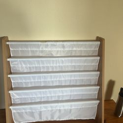 Montessori-style wooden clothing rack with built-in shoe shelf.