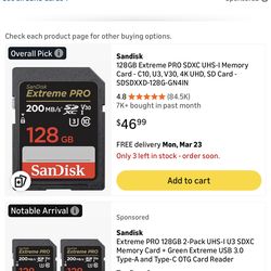 SanDisk 128GB Extreme PRO SDXC UHS-I Card$18Kent, WA