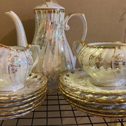 Vintage Floral Coffee Pot Demitasse Cups Saucers Made in Japan Cobalt Blue Gold Pink Flowers Tea Japanese