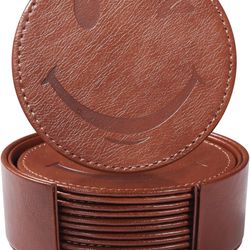 Brand new Coasters Set of 6 with Holder, 6-Piece Leather Coasters with Embossed Smiley Designs - Durable Coasters Set for Home, Bar, or Office - Brown$15Redmond, WA