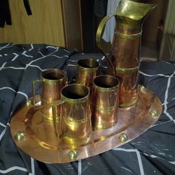 antique copper and brass pitcher and four mugs set with tray $199Puyallup, WA