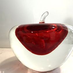 Vintage Mid Century Encased Hand Blown Clear Red Apple Art Glass Paperweight approx 3.5” $30Tacoma, WA