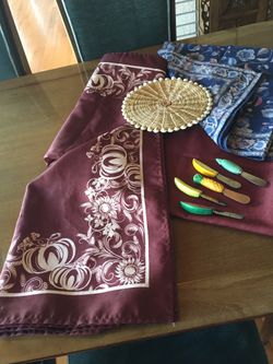 TWO BURGUNDY AND CREAM COLOR TABLE CLOTHS, ONE LOVELY EUROPEAN DESIGN CARD TABLE CLOTH, 5 FRUIT AND VEGGIE SPREADING KNIVES AND ONE BASKETWEAVE SURRO$10Tacoma, WA