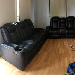 Brand New Black Leather Baseball Stitched 3pc Reclining Set With Storage Compartments A Drop Down Table & Built In Cup Holders $1,500Puyallup, WA