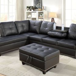 Brand New Black Leather Sectional With A Drop Down Table,Built In Cup Holders & Storage Ottoman $715Puyallup, WA